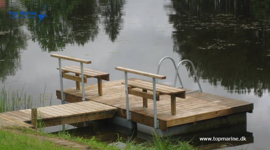 ECO-badepontonen med bænke fra Top Marine kombinerer miljøvenlig innovation og social komfort for en harmonisk adgang til vandet.