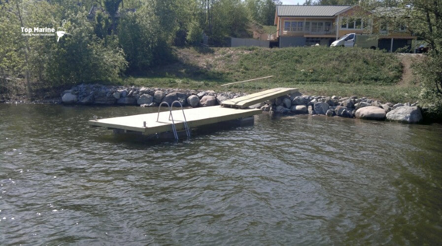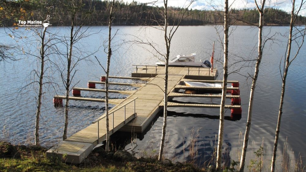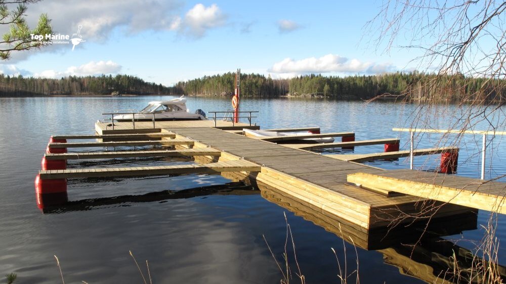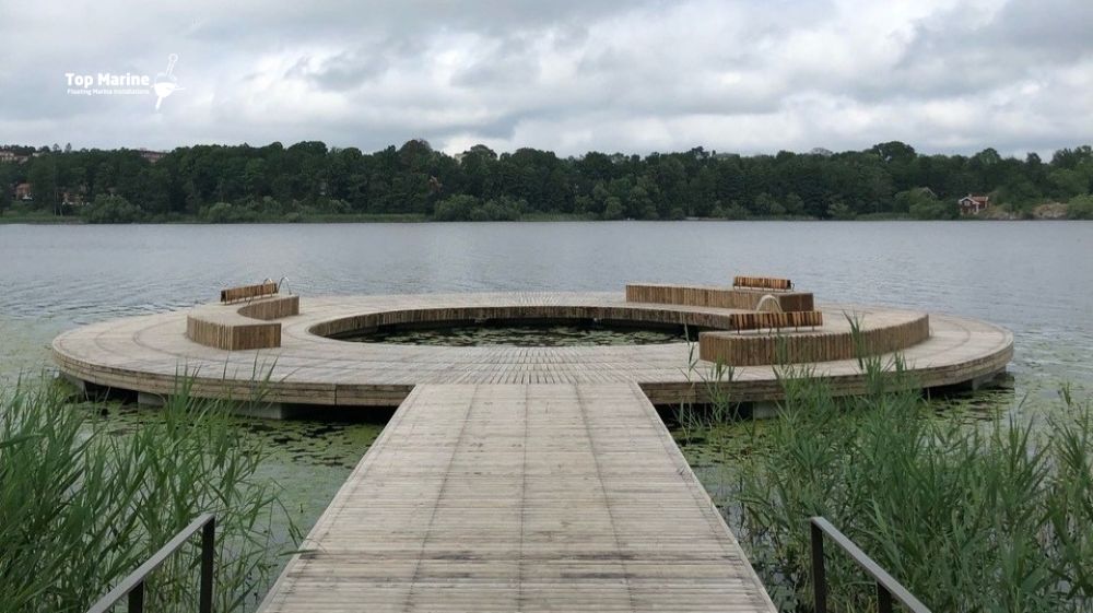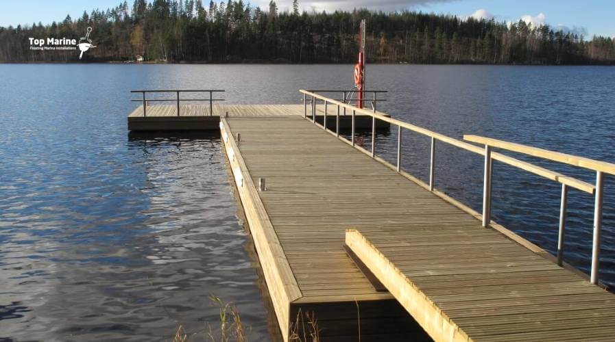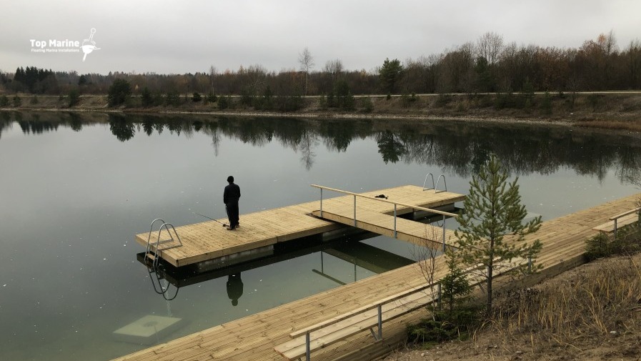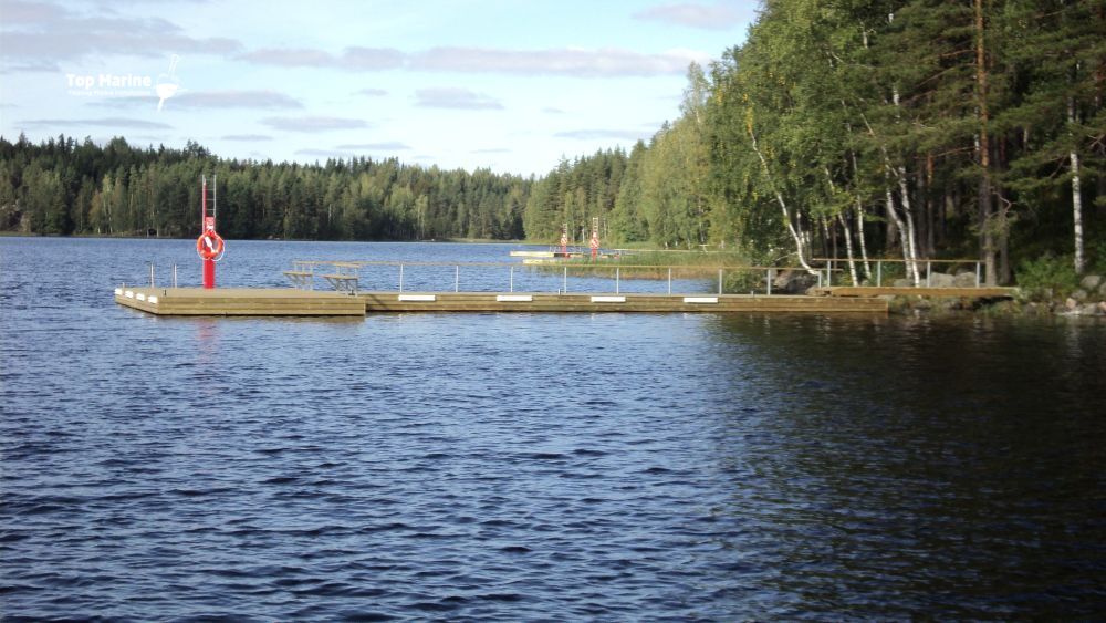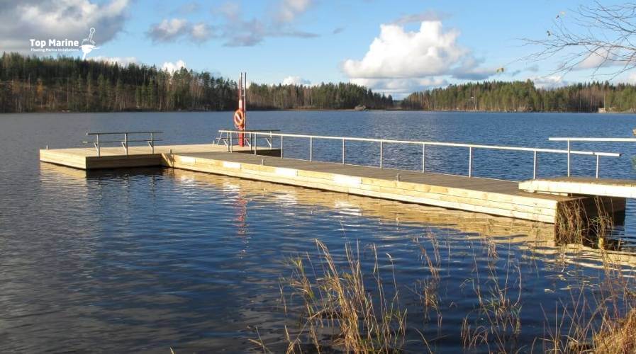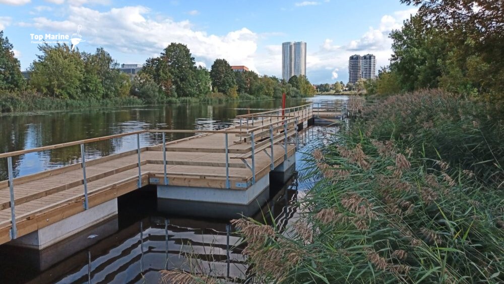 Træpontoner med betonflåd og rækværk ved Rantalinna