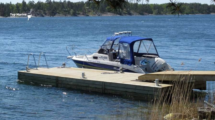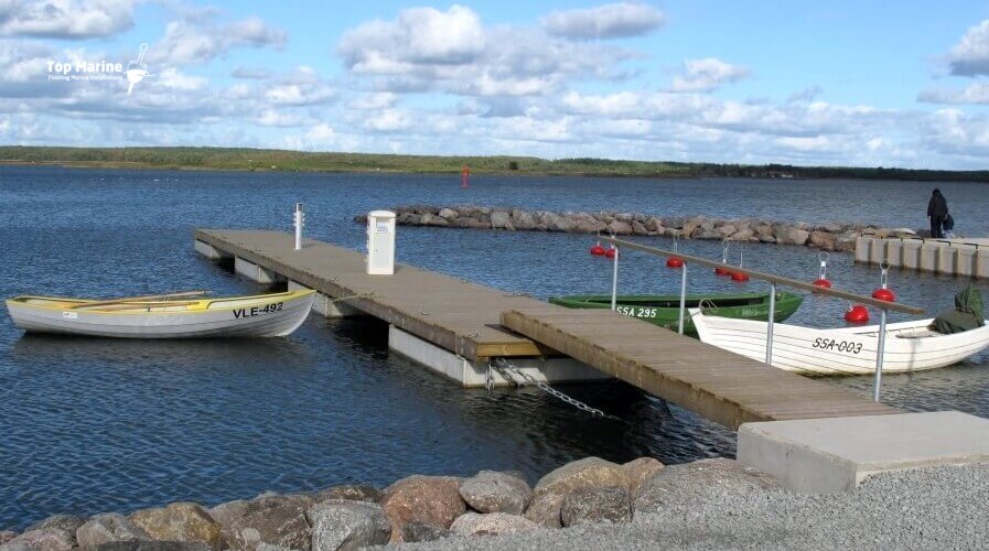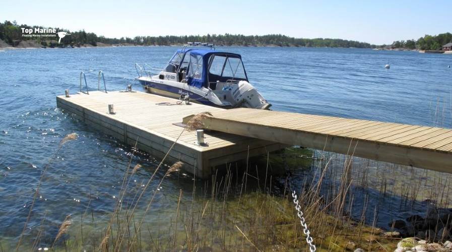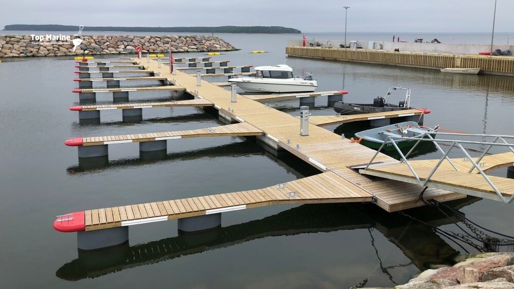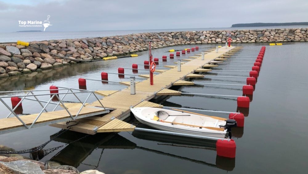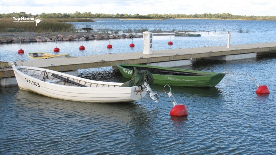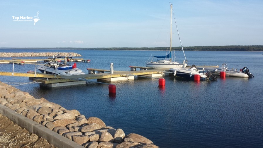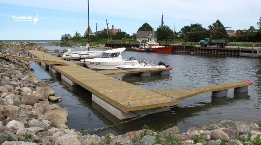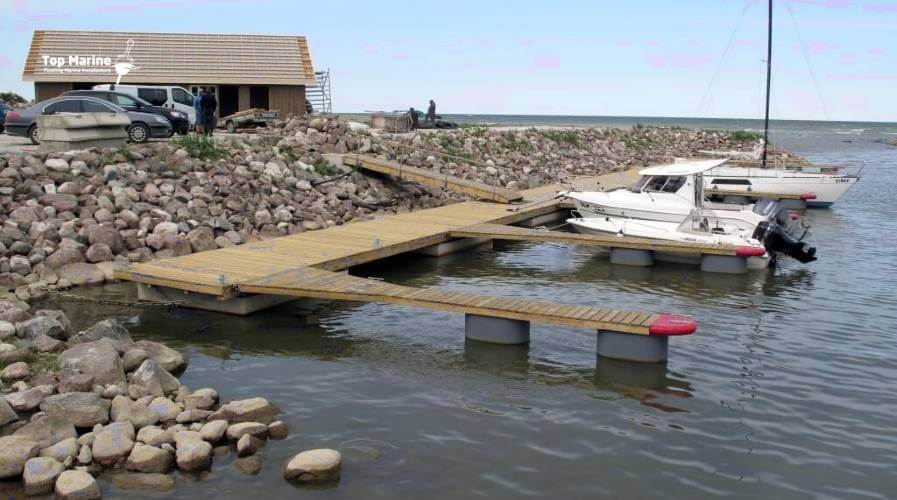 Træpontoner med betonflåd og fortøjningsfingre ved Salmistu