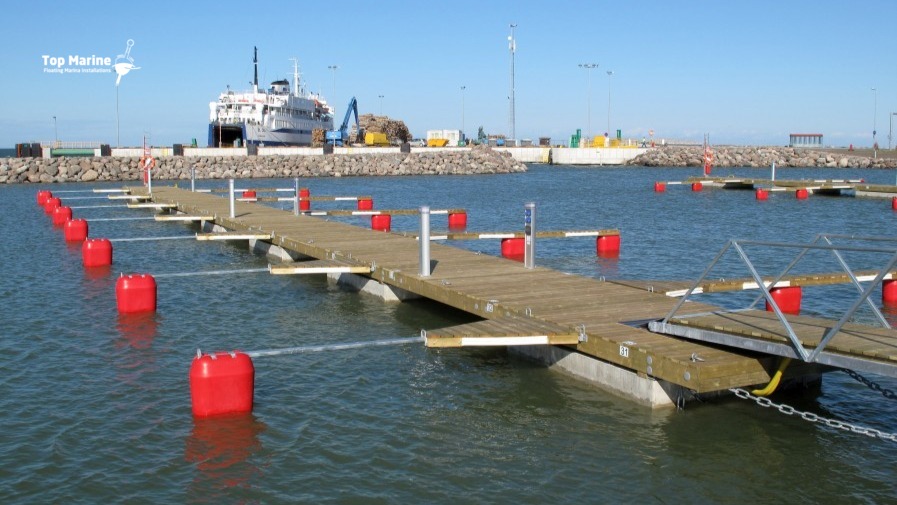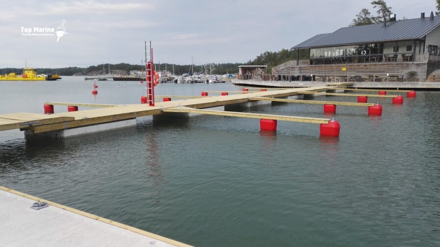 Træpontoner med betonflåd ved Kungla havn med badefaciliteter